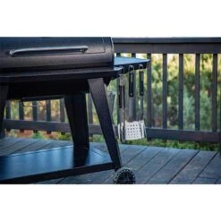 Lorsque le barbecue est allumĂ©, la cheminĂ©e intĂ©grĂ©e favorise lâadmission dâair tout en dirigeant les fumĂ©es loin de vos invitĂ©s. Pour maximiser le confort dâutilisation, le barbecue dispose de deux tablettes Ă©quipĂ©es de porte-ustensiles, gardant ainsi tous les outils nĂ©cessaires Ă portĂ©e de main.
