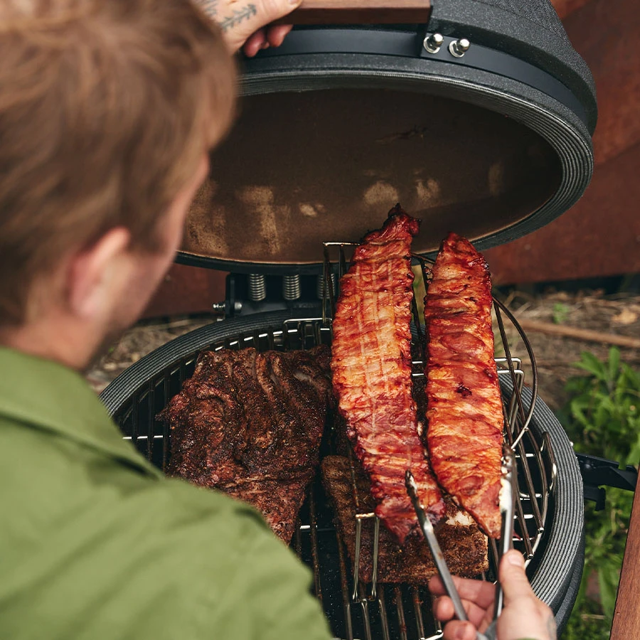 Équipé de nombreux accessoires comme des déflecteurs de chaleur pour une expérience de cuisson optimale, ce barbecue sera parfait pour fumer, rôtir, cuire à la vapeur ou même gratiner vos aliments. Grâce à la céramique réfractaire, il est même possible de cuire des gâteaux et pâtisseries directement dans votre barbecue. Et avec le système de cuisson multilevel, vous pourrez varier plusieurs modes de cuisson lors d’une même fournée. Au niveau de l’entretien, celui-ci se trouve facilité par la présence du bac à cendres dans le barbecue.