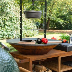 Fabriqué en acier corten, ce brasero plancha dispose d’un aspect rustique qui s’adapte à de nombreux extérieurs. De plus, ce matériau bénéficie d’une très grande résistance à l’humidité et à la corrosion grâce à la patine dont il est recouvert. Le socle possède également un large espace de stockage de 0,3 m³ qui vous permettra de ranger facilement vos bûches pour toujours avoir de quoi alimenter votre feu pendant vos repas. Le brasero est surmonté d’une plaque de cuisson en acier carbone d’épaisseur 12 mm dotée d’une grande capacité à absorber la chaleur, offrant ainsi une cuisson homogène pour tous vos aliments. Avec son diamètre de ∅100 cm, cette plaque bénéficie d’une surface de cuisson de 0,55 m², idéale pour cuisiner pour 14 à 16 convives. Côté combustion, Ofyr a choisi de munir la vasque de plusieurs trous favorisant la circulation de l’air dans le foyer et permettant un allumage rapide.