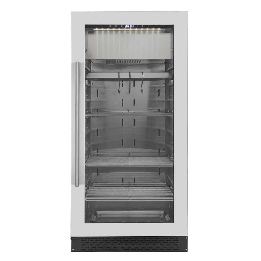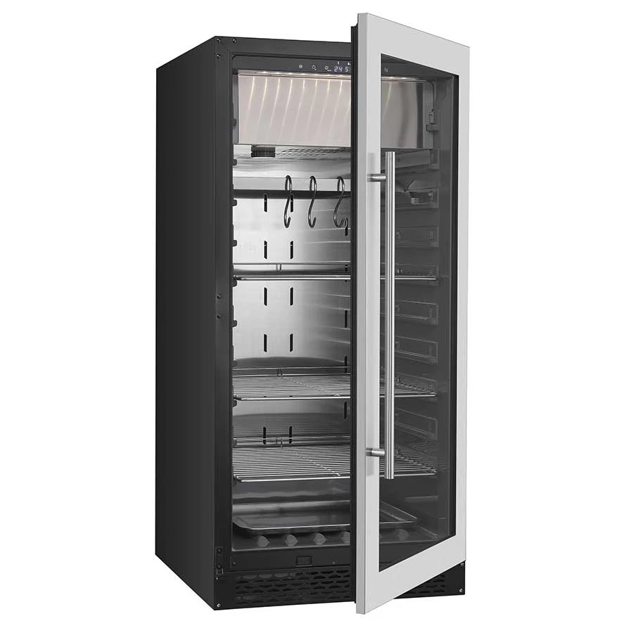 Cette cave de maturation offre une humidité relative de 60/85%, facilement réglable pour la maturation de tous vos aliments. Elle est également équipée d’un éclairage LED, d’un affichage LCD et de trois grilles de 480 x 520 mm pour une organisation efficace de l’espace. Pour une utilisation plus commode, la cave dispose aussi d’une porte verrouillable et réversible, avec une épaisseur d’isolation de 55 mm. Le dégivrage automatique facilite l’entretien, et le niveau sonore de 41 dB garantit une utilisation discrète.
