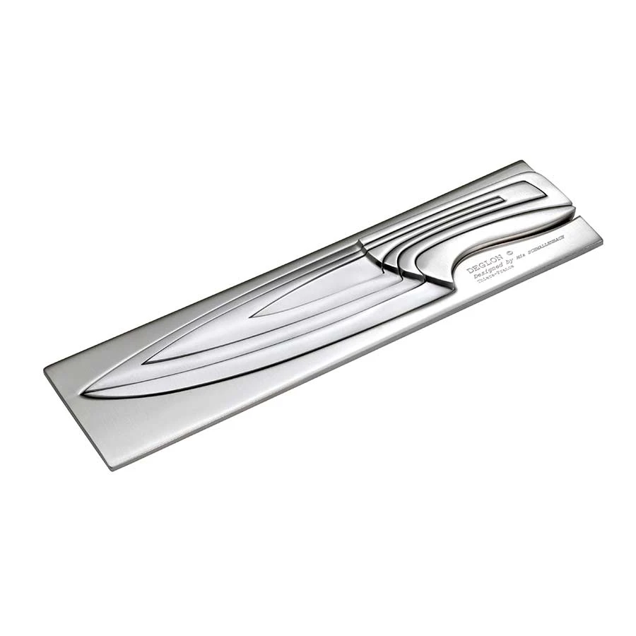 L’ensemble couteaux de cuisine design Meeting inox Deglon allient performance et design. Designés par Mia Schmallenbach, cette véritable oeuvre d’art est déposée, permettant l’unicité du design. Cet ensemble de couteaux a gagné le prix de la 5ème Bourse européenne de la création coutelière et comprend qu’âtres couteaux encastrés les uns dans les autres. Ce design permet un gain de place lors du rangement en plus d’une décoration hors pair et atypique.