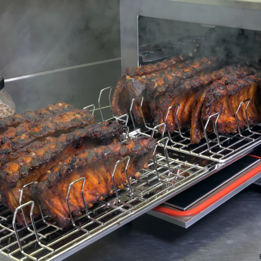 La grande capacité de ce fumoir (72 poissons de 250g ou 36 de 300g ou 18 kg de viande environ) le rend parfait pour la restauration ou les grands rassemblements. Avec un espace de 40 mm entre chaque niveau, vous pouvez facilement placer une variété d’aliments différents dans le fumoir en même temps. L’un des gros avantages des fumoirs Helia smoker, c’est leur capacité à ne produire que très peu de fumée, permettant d’en faire une utilisation domestique en intérieur.