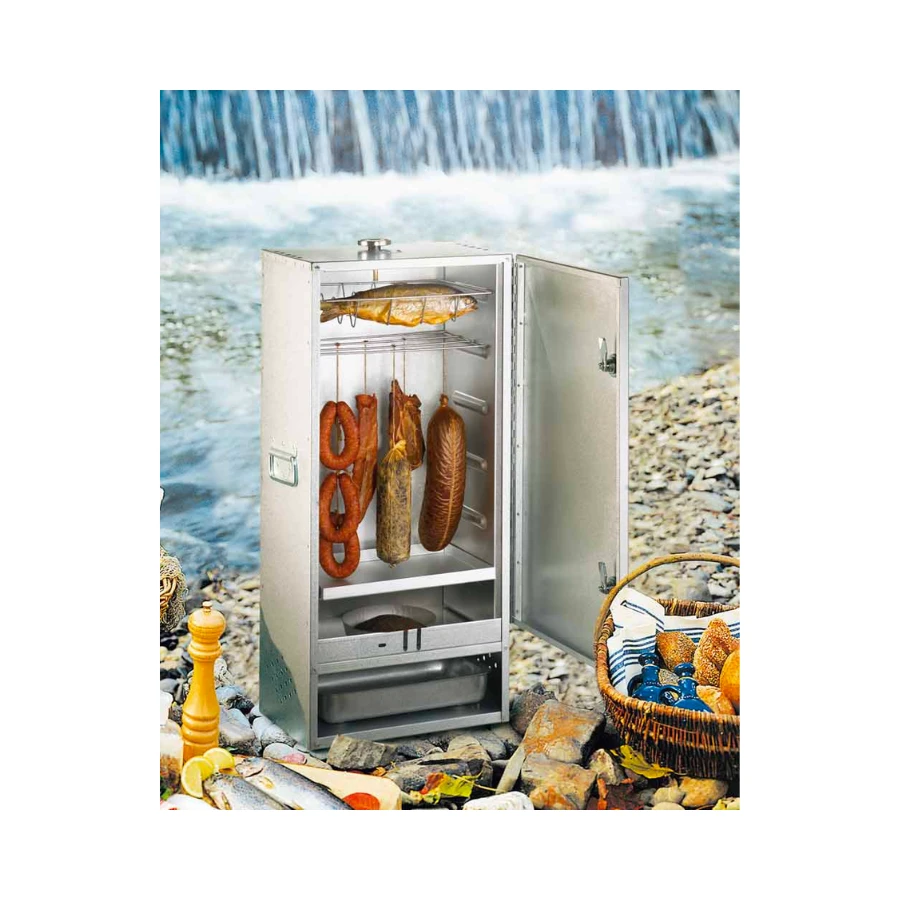 Le fumoir avec porte en tôle d’acier aluminé Peetz est fabriqué en Allemagne, en acier aluminé. Matériau robuste et plus abordable que l’inox, il vous confère un fumoir de qualité et durable. Grâce à son système d’aération et son thermomètre directement accessibles depuis le dessus du fumoir, la gestion de la température devient un jeu d’enfant et vous êtes sûr de réussir vos fumages. Sa capacité à fumer 16 petits poissons en même temps grâce aux grilles vous permet de nourrir une grande tablée sans difficulté.