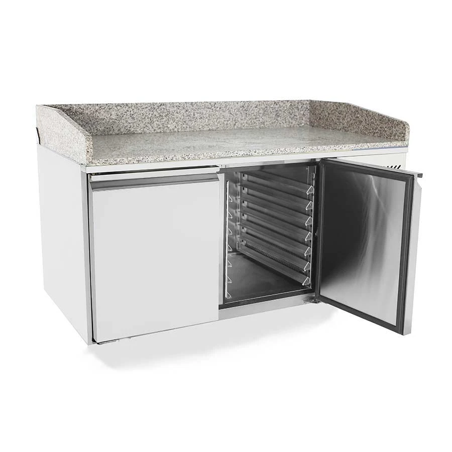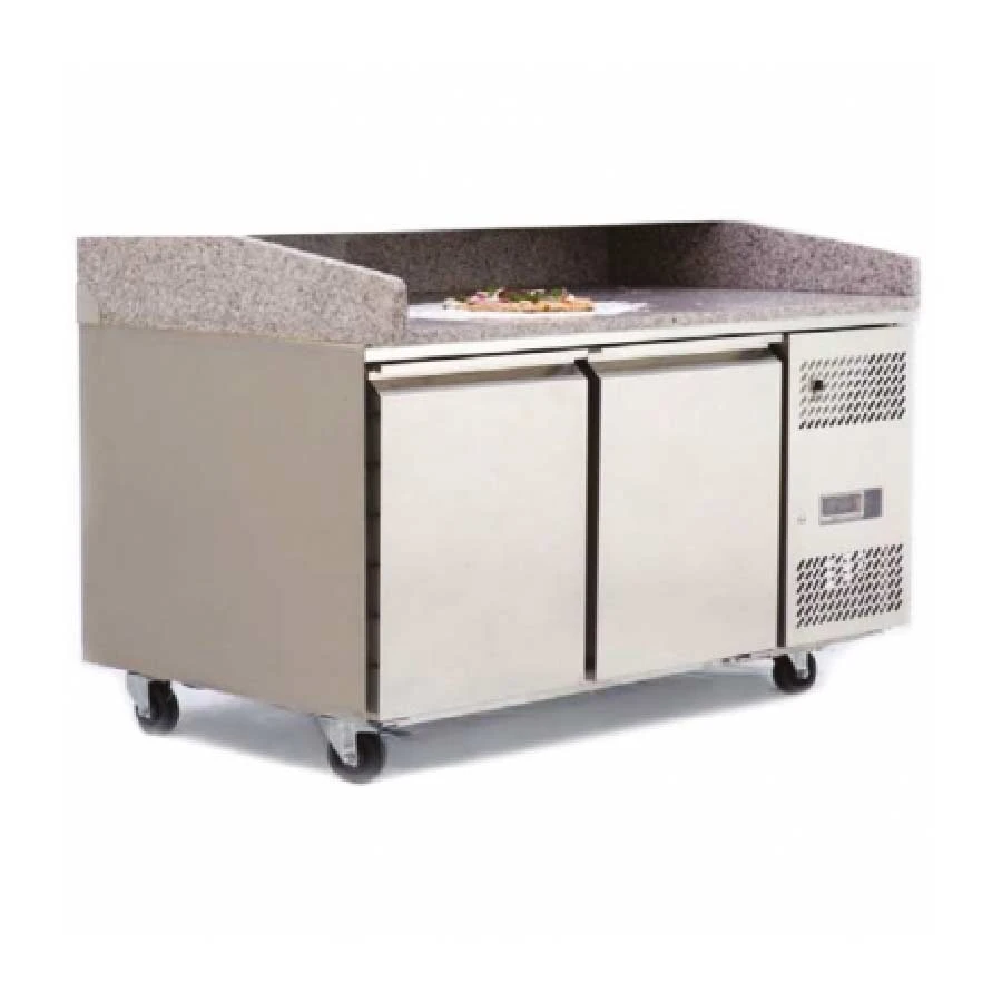 Ce meuble à pizza 2 portes est l’appareil frigorifique utilisé par de nombreuses pizzérias. Sa table en granit est un excellent plan de travail pour travailler la pâte à pizza. De plus, le bloc réfrigéré situé juste en dessous permet de conserver les ingrédients à portée de main dans un environnement hygiénique sans aucun risque de prolifération de bactéries. Ainsi, ce meuble à pizza permet de servir des plats qualitatifs tout en respectant scrupuleusement la chaîne du froid. Avec ses dimensions de 1510 x 800 x 825 (H : 1000 mm avec dosseret granit), il est assez grand pour accueillir vos pizzas, tout en étant assez compact pour tenir dans votre cuisine. D’une capacité de 480 litres, le tour à pizza 2 portes Atosa peut contenir jusqu’à 12 pizzas à la fois. Ce meuble à pizza est livré sans grille. Effectivement, nous savons que les professionnels de la restauration insèrent directement des plaques de pâtisseries ou des bacs à pâtons dans les glissières. Si vous ne bénéficiez pas de ces accessoires, nous proposons des grilles rilsanisées blanches.