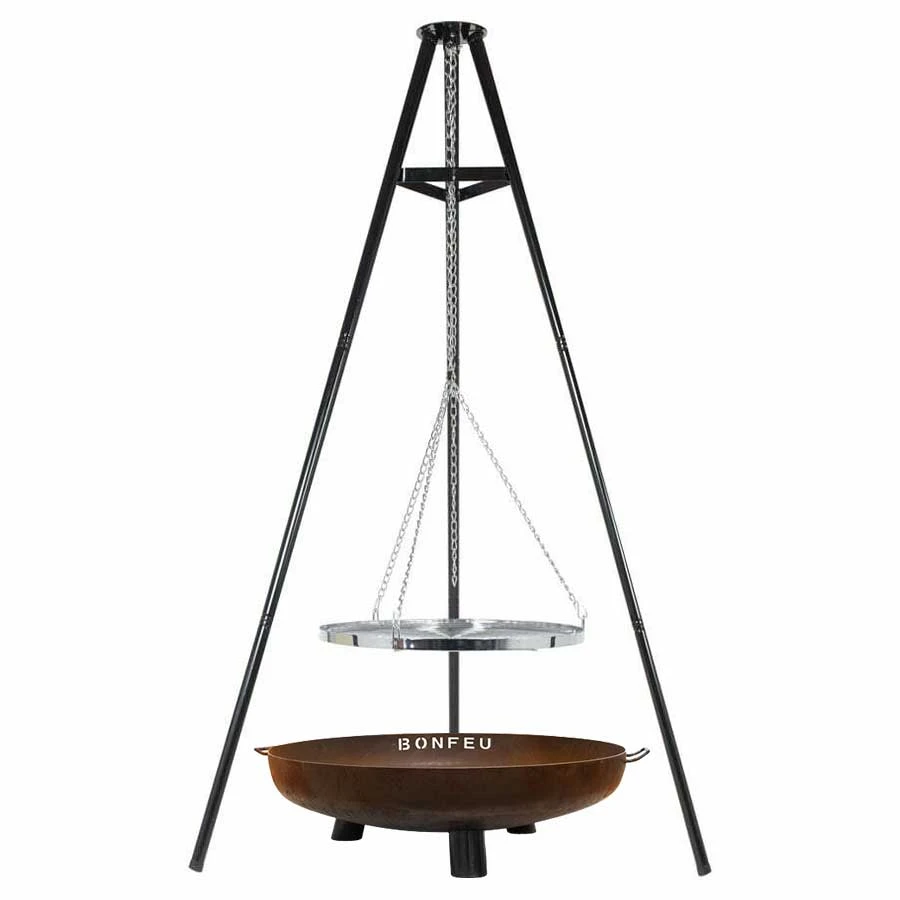 - Un trĂ©pied avec grille suspendue BonFeu. Cet accessoire design en acier se compose dâun trĂ©pied de dimensions 128 x 108 x 172 cm, de chaĂźnes en acier et dâune grille de cuisson. Simple Ă installer au-dessus dâun bol Ă feu grĂące Ă son poids de seulement 8,5 kg, le trĂ©pied vous permettra de rĂ©aliser des grillades trĂšs facilement. Et grĂące aux chaines en acier, la hauteur de la grille est aisĂ©ment rĂ©glable pour obtenir une cuisson parfaite.