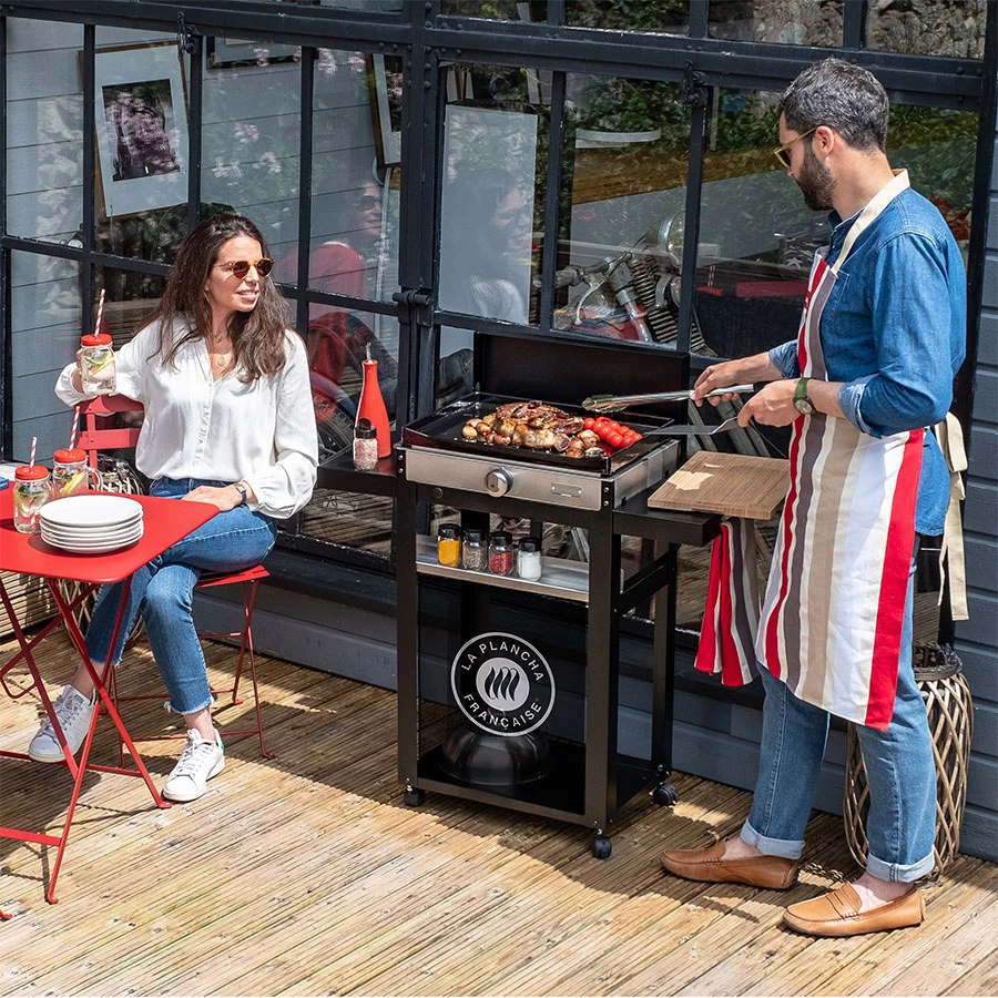 La plancha électrique sur chariot 150 Duo Edition La Plancha Française est un équipement idéal pour les amateurs de grillades en extérieur. Avec sa plaque en fonte émaillée de 50×35 cm, idéale pour cuisiner pour 4 à 8 convives, elle offre une zone de cuisson régulée par un thermostat réglable de 50 à 300°C. Son bouton de commande ergonomique et antidérapant, associé à un témoin lumineux de mise en chauffe, en font un appareil facile à utiliser.