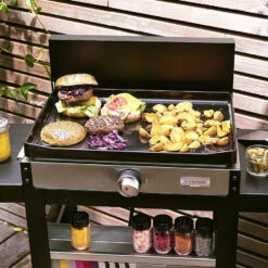 La plancha est équipée d’un récupérateur inox rectangulaire inclus, et son chariot est pourvu de 2 tablettes amovibles réglables sur 3 positions ainsi qu’un porte-épices. En termes de dimensions, la plancha est ouverte de L92 P47 H105,5 cm et fermée de L53 P42 H91,5 cm pour un poids de 22 kg. La plancha fonctionne au courant électrique 220V.
