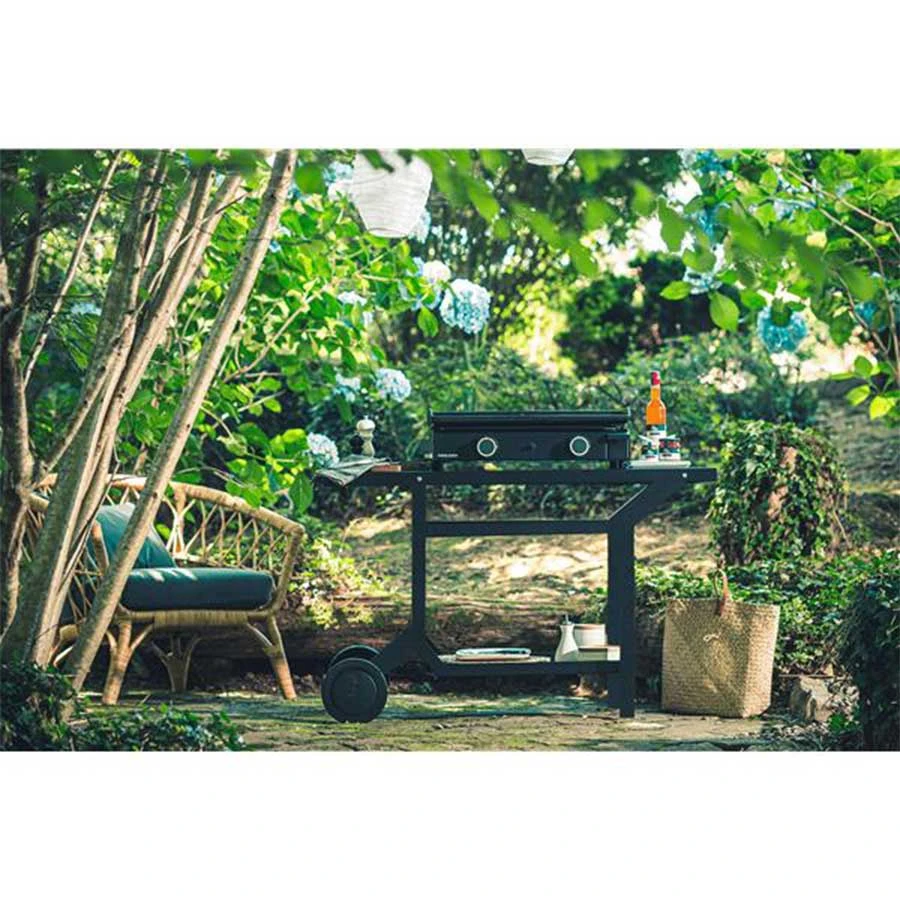 Le design de la plancha a également été très soigné. En effet, le châssis est conçu en acier peint noir qui résiste à la chaleur tout en offrant à votre extérieur un aspect moderne et épuré. Les rebords de la plaque de cuisson sont relevés afin d’éviter la projection des graisses et jus de cuisson pour une utilisation en toute sécurité. Mais le design et les performances ne sont pas les seuls atouts de cette plancha, qui est aussi équipée de plusieurs accessoires qui faciliteront son utilisation ou son entretien comme l’allumage piezzo ou un bac de récupération.