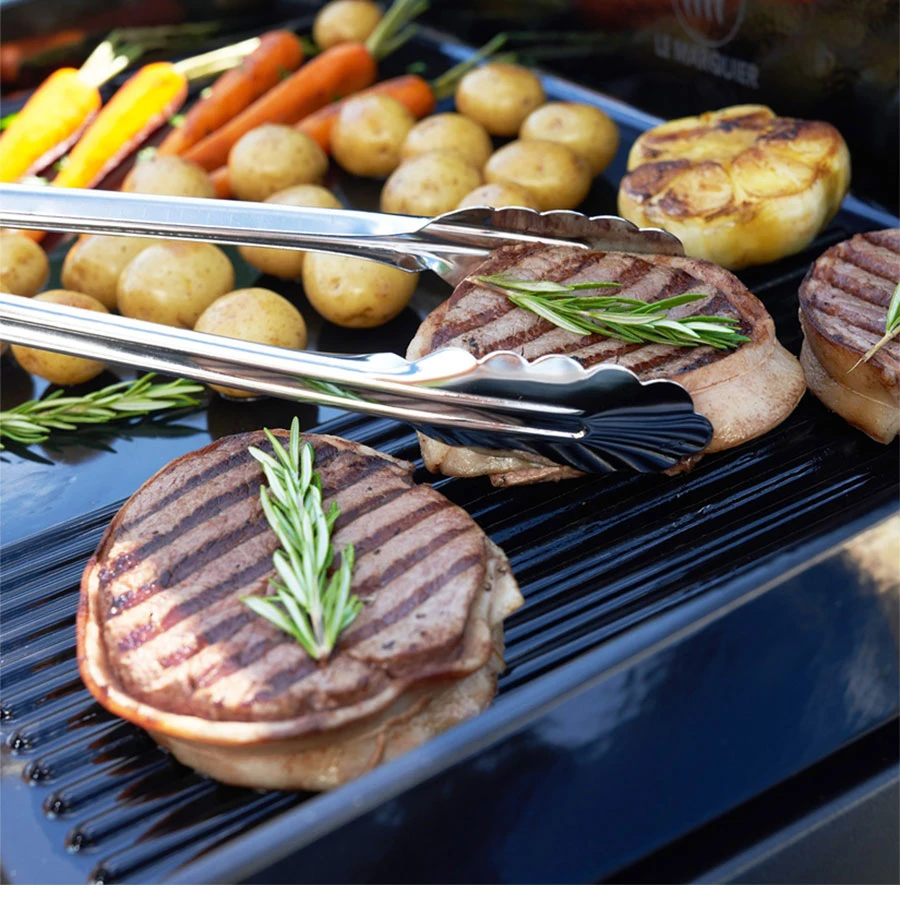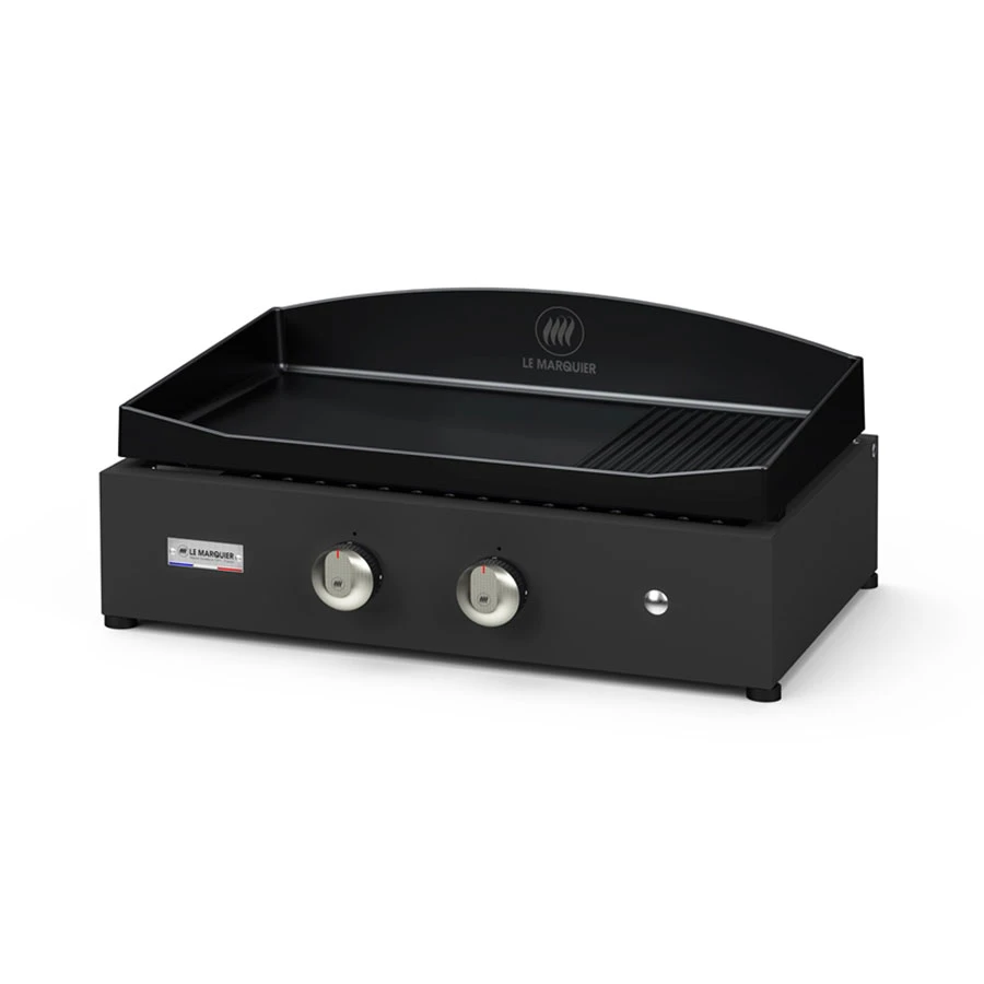 Elle est équipée de deux brûleurs inox avec allumage piezzo mécanique et de boutons de commande ergonomiques et antidérapants pour un contrôle facile de la température. De plus, pour un nettoyage plus facile de l’appareil, Le Marquier l’a équipé d’un bac récupérateur en acier inoxydable qui va récolter en cours de cuisson le surplus de graisse et de résidus alimentaires. Et grâce à la fonte qui compose la plaque de cuisson et à ses propriétés antiadhésives, vous n’aurez pas besoin de forcer pour nettoyer votre plancha.